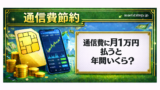 通信費節約をテーマにしたバナー画像。緑と金を基調としたデザインで、左側に金色のSIMカードとコイン、中央に株価チャートが表示されたスマートフォン、背景に都市と紙幣のイラストが描かれている。右側のホワイトボードには「スマホ代を月3000円にする方法【Z世代必見】」と強調された日本語テキストが配置されている。 通信費節約